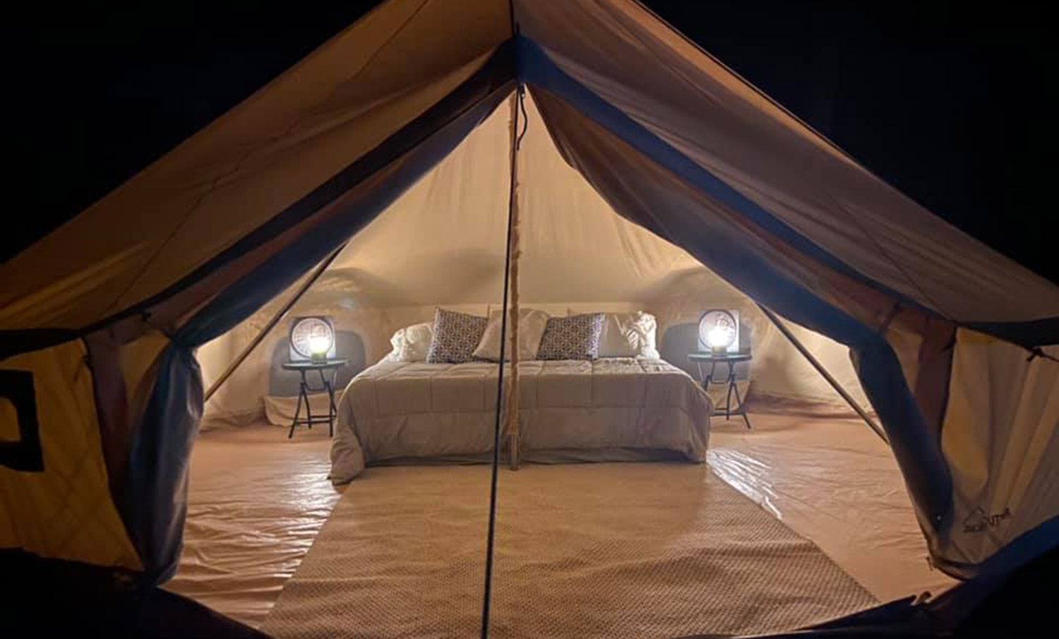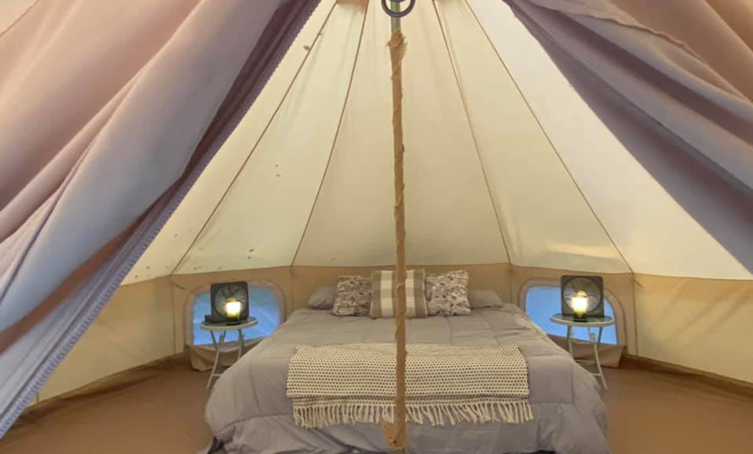 Spacious 16 Foot Bell Tent, with either 1 Queen Bed (can add 1 or 2 twins ), or 1 KING (no twins can be added) Night Stands, Rug, Throw Pillows, Sheets, Comforters, Throw Blankets, Décor,  Lamps, 5 Gallons of Mountain Spring Water that we re-fill, tent warmer if needed - not full-on heat though. Fans in the summer.