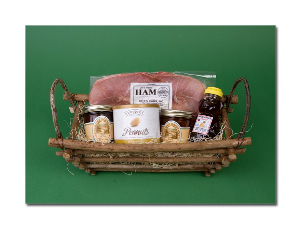 The Log Cabin Basket includes your choice of two 9 ounce jars of our Graves Mountain flavors, a half pound of Madison County’s Kite’s Happy Ham, Virginia peanuts from Ferdies and topped off with one 12 ounce Virginia Wildflower Honey Bear from Lunsford Farm.