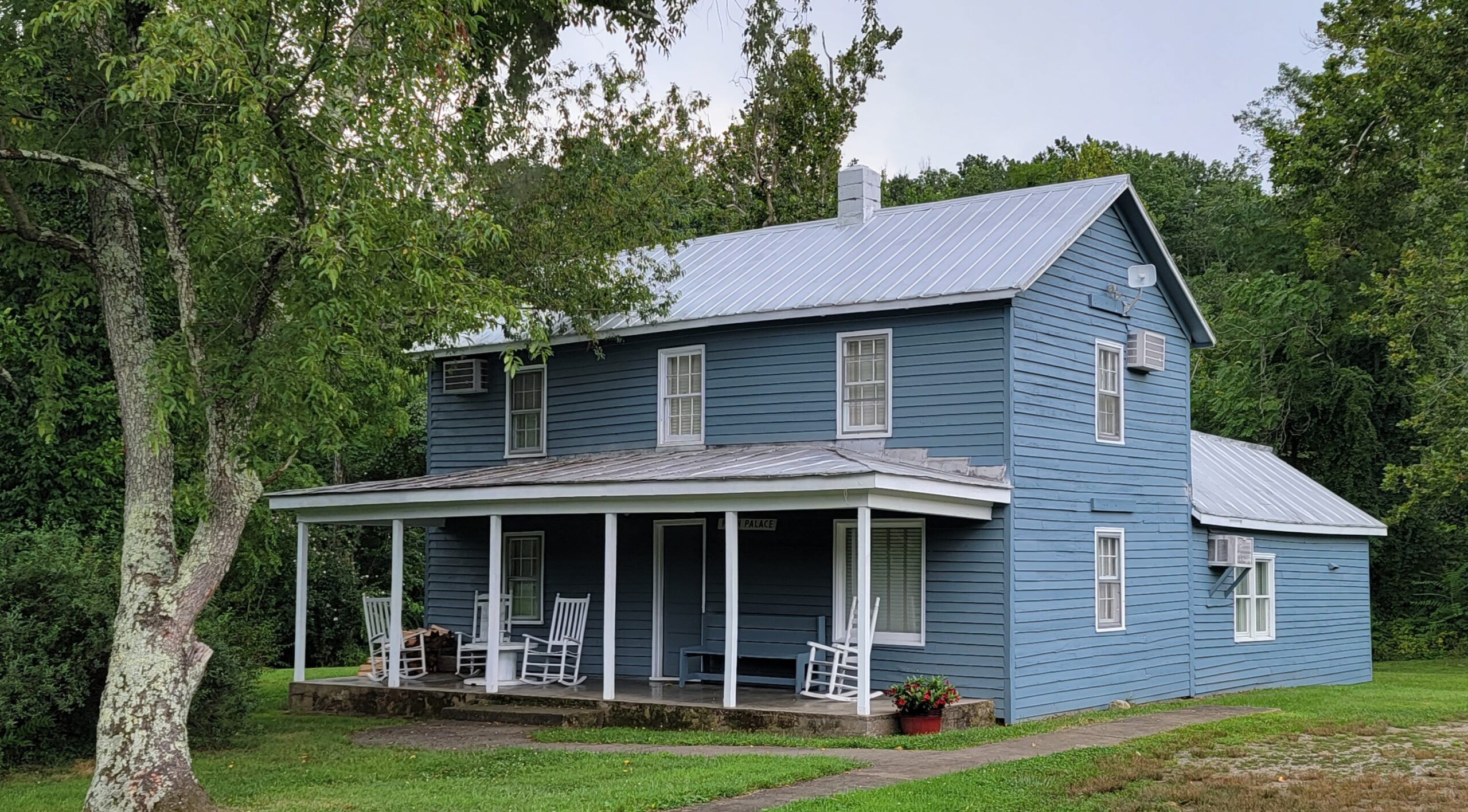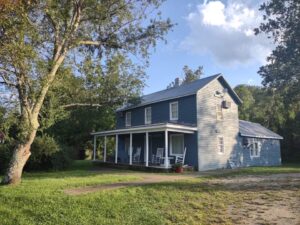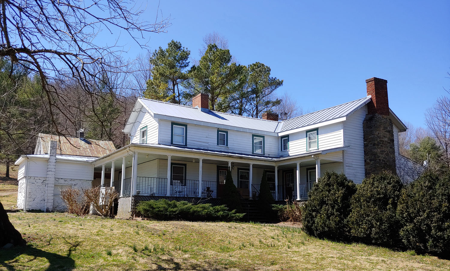 The front of the farmhouse has a three-sided porch with rockers, looking out to Rose River.