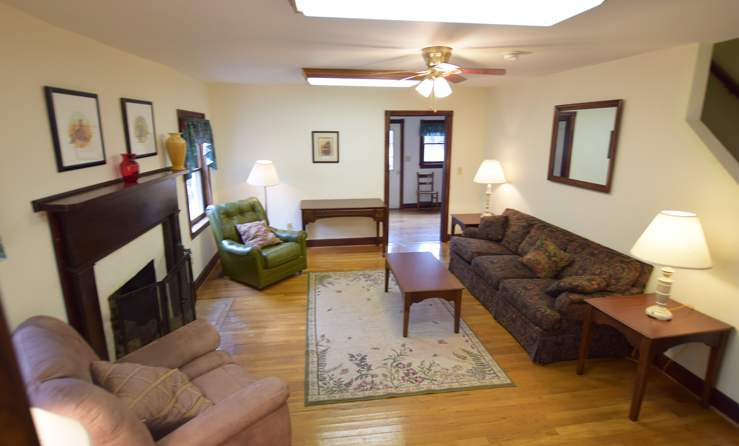 The living-dining area is large - split in two by the central stairs going up to two of the three bedrooms. There is a brick fireplace at the west end.